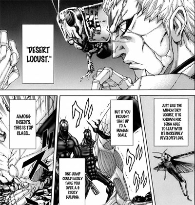 Terra Formars does dabble in some well-worn science fiction tropes to go with its nonsense action. There are concerns raised of an overpopulated world, discussions had about people undergoing dangerous surgery to undergo even more dangerous missions belonging to lower classes of people than the rich and the safe, that sort of thing. Evolution into humanoid forms aside, the Terraformars that have risen from the cockroach society essentially allow for a manga-length take on Aliens. There are people back on Earth who have different success parameters for dealing with the Terraformars. None of it is particularly unique or surprising, but it is fun. The best part of the manga may in fact be the juxtaposition of reality versus fantasy where the crew of BUGS 2 precede their insect-powered super attacks with brief facts about the insect they’ve been bonded with and what makes them so formidable. It’s not the giant stinger coming out of a man’s wrist that destroys remorseless cockroaches; it’s facts. These brief biology lessons are thrown into the narration boxes in such a way that’s it’s impossible not to read them as being a nature documentary intruding upon your comic about a bug dude kicking another bug dude really, really hard.