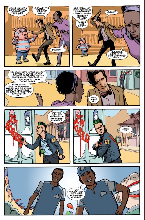 Meanwhile, the Eleventh Doctor has whisked Alice away on an adventure, hoping to help her feel better, but since TARDIS usually has other plans, they land on a planet taken over by a theme park. All of the workers are strangely happy, and none of the patrons are complaining. Rokhandi is supposed to be full of natural splendor, and instead the Doctor is being offered free Rokhandi floss.