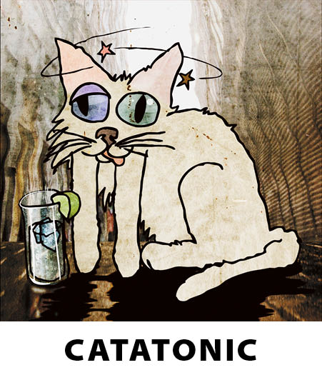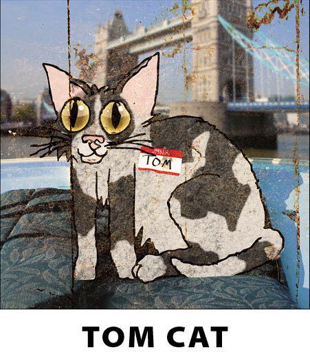 The cats themselves are somewhat simple doodles placed onto a photographic background. Every image is side-by-side with its title, which vary from the more obvious (“Cat Scratch Fever”) to the I see what you did there:
