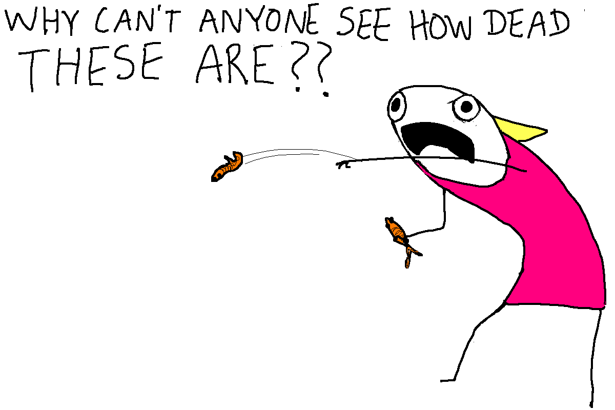 And the analogy about the dead fish is perfect. The guy asking, “Why not just make them be alive again,” might as well be my dad saying “DON’T BE DEPRESSED,” and me saying, like, sure dad. I can definitely just decide to do that, for you. And my boyfriend is the guy who used to say, “Your fish aren’t dead, they’re only sleeping! They’ll be okay! Stop worrying!”