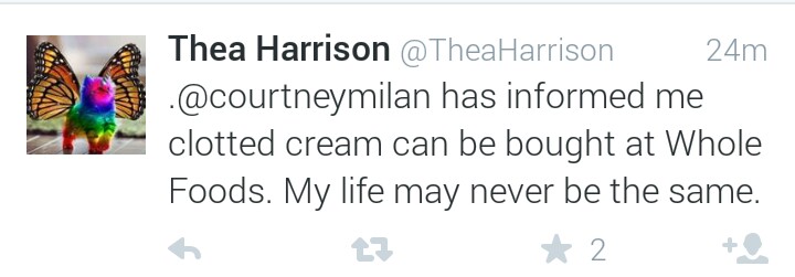 Edited to add: Thea’s cool factor just went up by a million bajillion times. Her last tweet involved Courtney Milan!