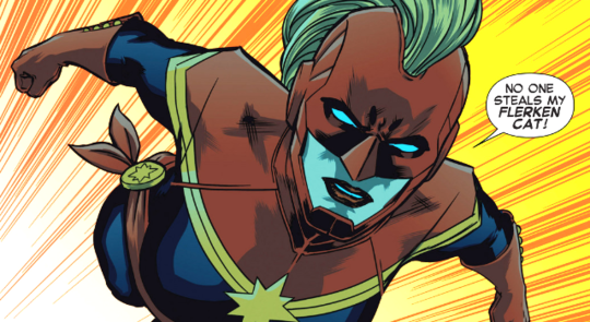Meet Carol Danvers. She used to be a pilot, but after the explosion of a Kree device gifted her with alien powers, now she’s an Avenger who lives in the top of the Statue of Liberty and makes out with Iron Patriot on the side. She’s the kind of gal who takes her cat into space. She loves Star Wars and punching people. We have only just met, but I love her.