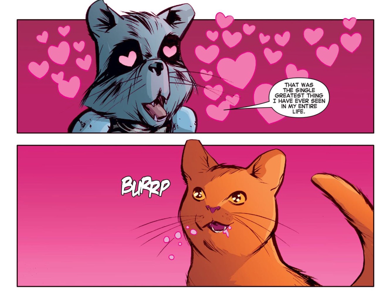 The first story was my favorite. Following up on Rocket and Carol’s argument from the first volume over whether or not Carol’s beloved cat Chewie was in fact not a cat, but a flerken, we find out that, yes, Chewie is a flerken. In fact, she’s THE flerken. As in, the only one left. Well, for now. Not even a bunch of space pirates trying to kidnap Chewie convinces Carol of her flerkenness. It’s only after Chewie lays one bazillion eggs in a storage locker that Carol gets it.