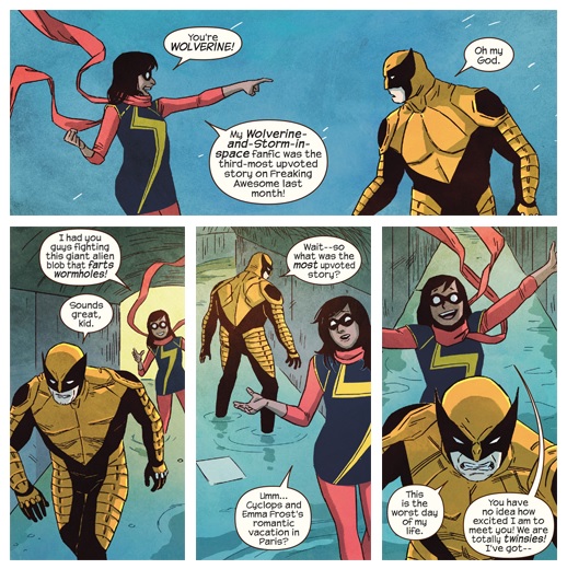 The Inventor is also ultimately responsible for one of the greatest superhero meet-ups of all time, and that is Kamala Khan and Wolverine. They have SUCH a good dynamic. She’s such a fangirl, but she’s also really competent herself, and her youth and invulnerability make a good contrast to Wolverine’s tired veteran persona, especially now that he’s SPOILER lost his healing factor and Kamala actually has to save his butt at one point END SPOILER. The Wolverine meet-up issues had a different artist than most of this volume (and volume one) but I really liked the aesthetic of it, even if I did miss the way that Adrian Alphona draws Kamala’s face.