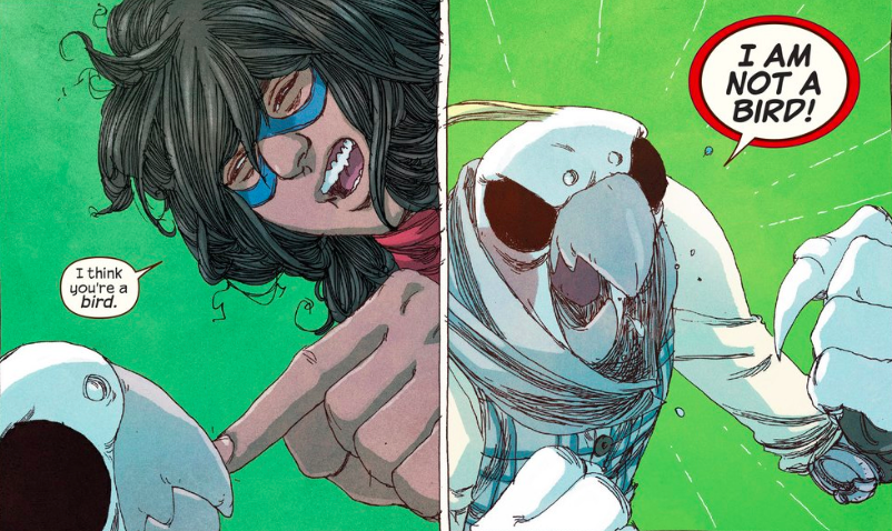 We got a hint of Kamala’s new nemesis The Inventor at the end of the first volume, but here he’s front and center. And he turns out to be a bird. Well, not really. Actually what he is is a clone of Thomas Edison who got contaminated by cockatiel DNA while he was growing in his little clone vat. He even has giant bird claw hands. First of all, I can’t even express to you how happy it makes me that Thomas Edison is a bad guy here. And even if I didn’t know the historical context, I still really dig this bird as a villain. There’s just something about the way he talks and the things he cares (coughcoughinferioritycomplexcoughcough) about that is simultaneously funny and terrifying. He’s not a mondo-level supervillain or anything, but he’s still a real danger, so he’s a good first test of Kamala’s powers.