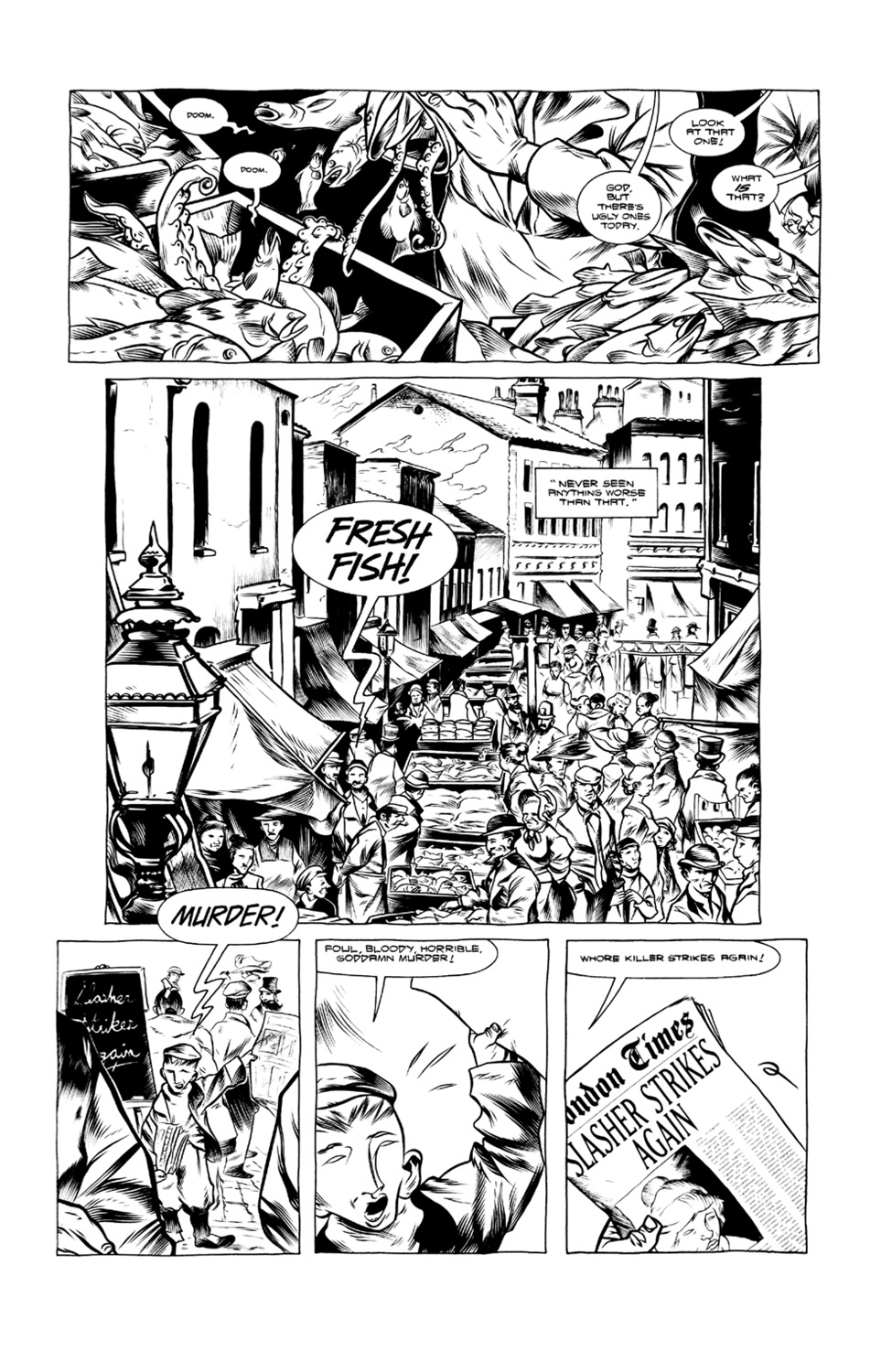 As Joe dashes after the young girl, he sees things and people that are curiouser and curiouser. All around them are these fish and fish-like creatures who mutter “doom”, and the creep factor gets ratcheted up. Then a man yells out that he is the embodiment of the wrath of god and goes to attack Jenny. Joe tries to intervene and the mysterious man pulls a cutlass. Believing that this is the man that has been slashing the whores, he cries out to the crowd and soon an angry mob is in hot pursuit. When Joe realizes his mistake in accusing this man, he finds he is too late. The man has been hung to death. He is brought to a seance and the dead man tells the tale of Jenny Finn and how she came to London.