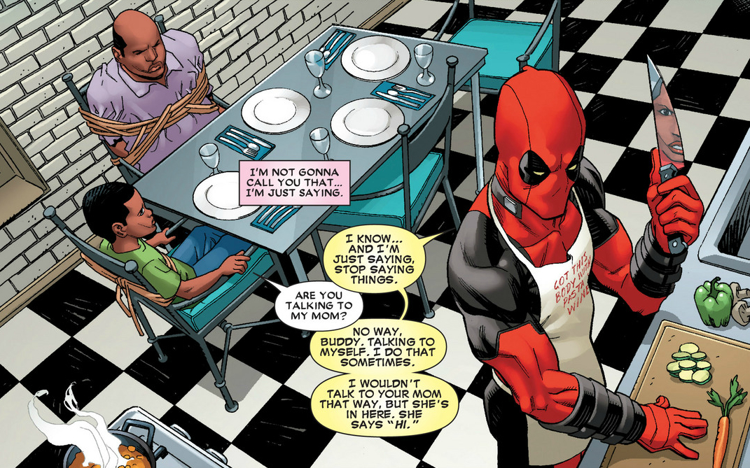 Volume 2 gets dark pretty quickly. Deadpool looks at the big picture and goes right for the end game without regard for conventional morality or the opinions of others. He’s not wrong, and it is entertaining to read, but it’s also a little uncomfortable. Deadpool’s mind is a beautiful and terrible place. Very bad things have happened and still happen to Deadpool. He turns around and does some fucked up shit in turn. As cynical and ironic as he may be, there is still a good heart at the core of Wade Wilson. He wants to save his friends. They just may not like the way he does it.