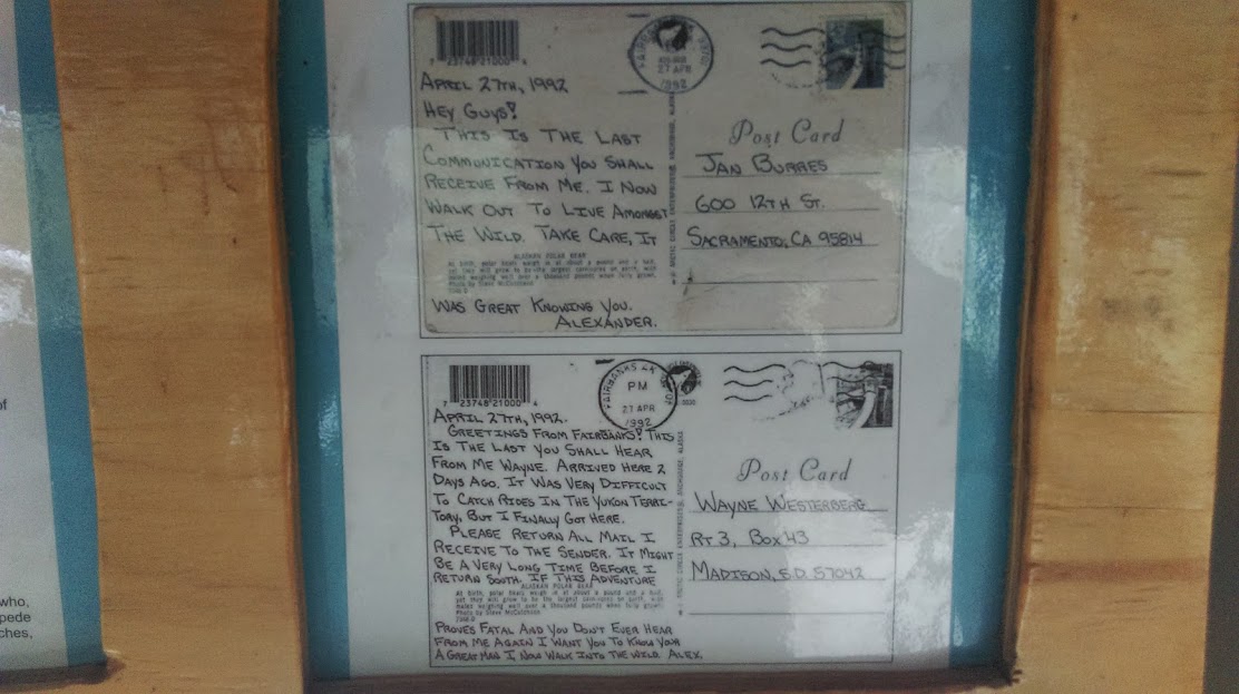 Two, while I was there, I went to 49th State Brewing in Healy, just north of Denali. (Crazy amazing Scotch and whiskey selection, plus beer, plus yak burgers. How can you go wrong?) They have the bus used in the Into the Wild movie in the corner of their patio area. While I know it’s just a replica – the real bus remains 20 miles in to the wilderness, and they highly recommend a guide if you want to go – it was a sobering experience to see it. It’s small, much smaller than I thought it would be, maybe twice the length of a VW van. It’s run down and the windows are broken. The floor is a termite’s wet dream. The cot in the back looks like it’s been chewed by bears and slept on by too many unwashed bodies, and all I could think about was McCandless’ joy at having an actual bed when he saw it. There are copies of photos and journal pages, along with the infamous last postcard – “I now walk in to the wild” – hung along the top of the bus walls. His handwriting seemed almost familiar, the carefully printed letters, straight and neat, even the entries towards the end of his life. I saw a lot of things on this trip – whales and bear and moose and caribou and mountains and the sheer enormity and power of Mother Nature – but seeing this bus will remain with me for a long time.