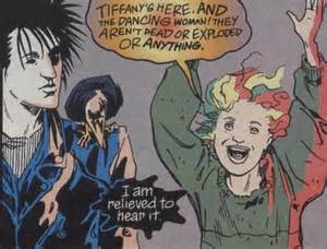 s Del of this fact, but she will not be swayed. It takes some convincing (and for Morpheus to think of another reason that he would want to walk in the waking world) but soon they are off on an adventure of sorts. Only this adventure ends in death or near-death for some of the mortals and not-so-mortals they need to see. At one point Dream calls off their quest, citing these deaths. Delirium goes into a tailspin –holy guacamole what would that look like?–so it’s not long before Dream gathers her up and they go see their brother Destiny.