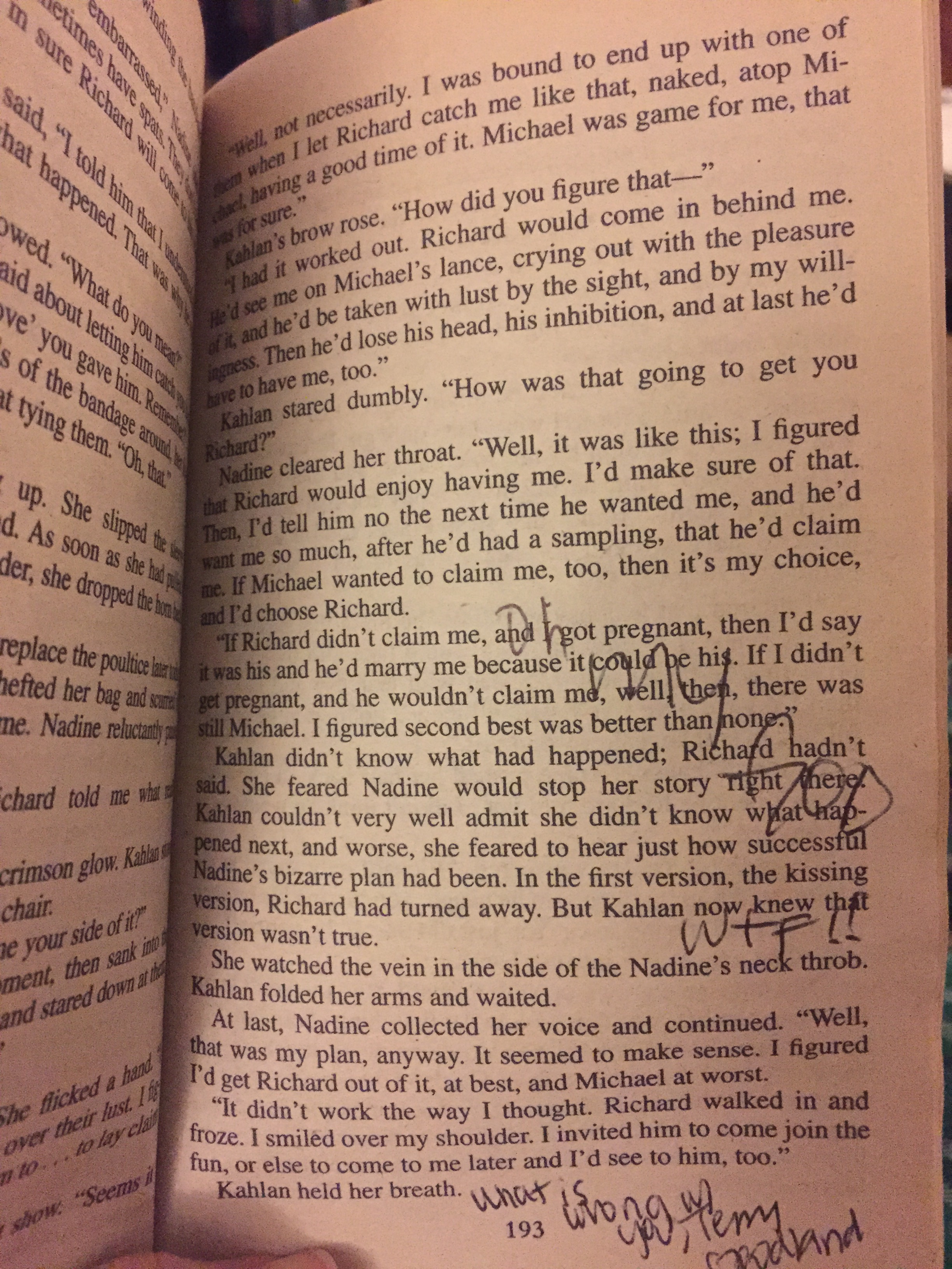 The pinnacle of the Hot Mess of Nadine comes when Nadine details to Kahlan why Richard and she never got together, and it turns out Nadine’s version of getting a man is just as bad and stupid as she is. She tries to snag Richard by seducing his brother, and planning for Richard to catch them. You should really read this whole page in its full glory to get the whole effect: