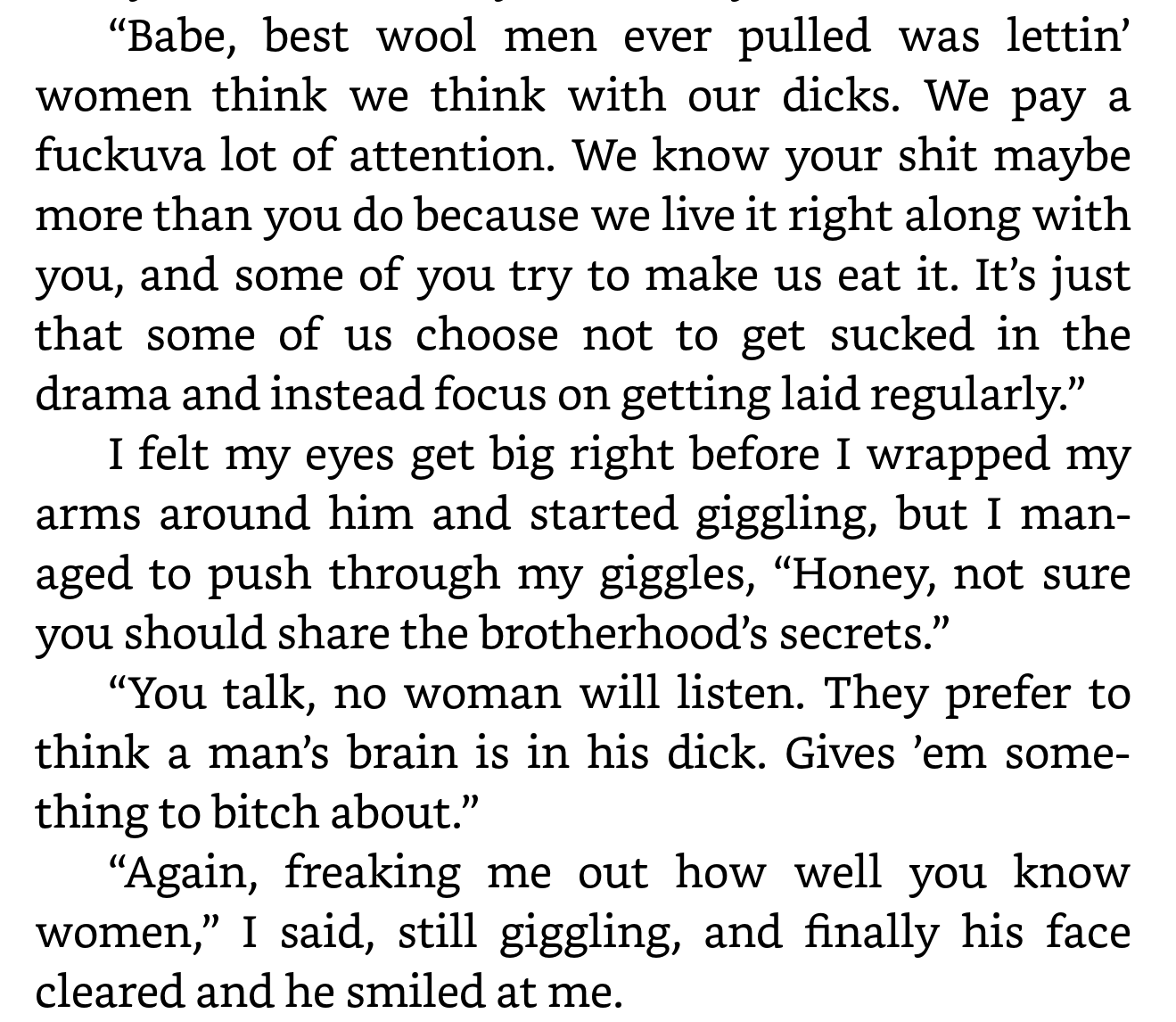 Trixie: KA does this bait-and-switch thing where, on the surface, it seems like the Big Bad Biker Dude is an asshole troglodyte but really, he has DEEP FEELINGS. We know this because of all the sex. Every. Fucking. Problem. is resolved with a good ol’ dicking. So, you see, the moral of the story is that you know your man cares – regardless of whatever else he does – because cock. Validation through sex is hardly new, Kitty.