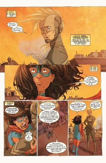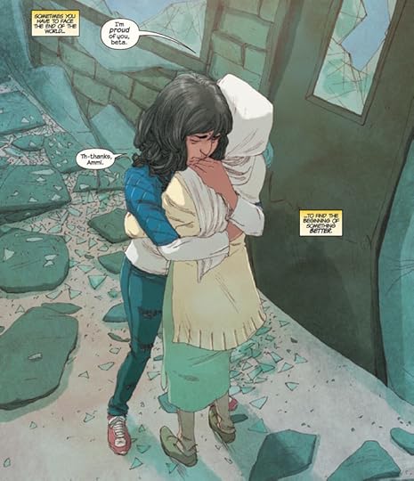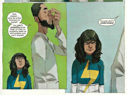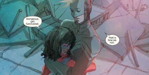 Oh, yes, I’m sorry, I buried the lede there. KAMALA GETS TO MEET HER HERO, CAPTAIN MARVEL. And it is oh-so-glorious. I loved the way their relationship played out, and their scenes together are partially responsible for the sort of elegiac feeling you get the whole time you’re reading it. Plus, seriously, she hugs a lot, like, right after meeting you: