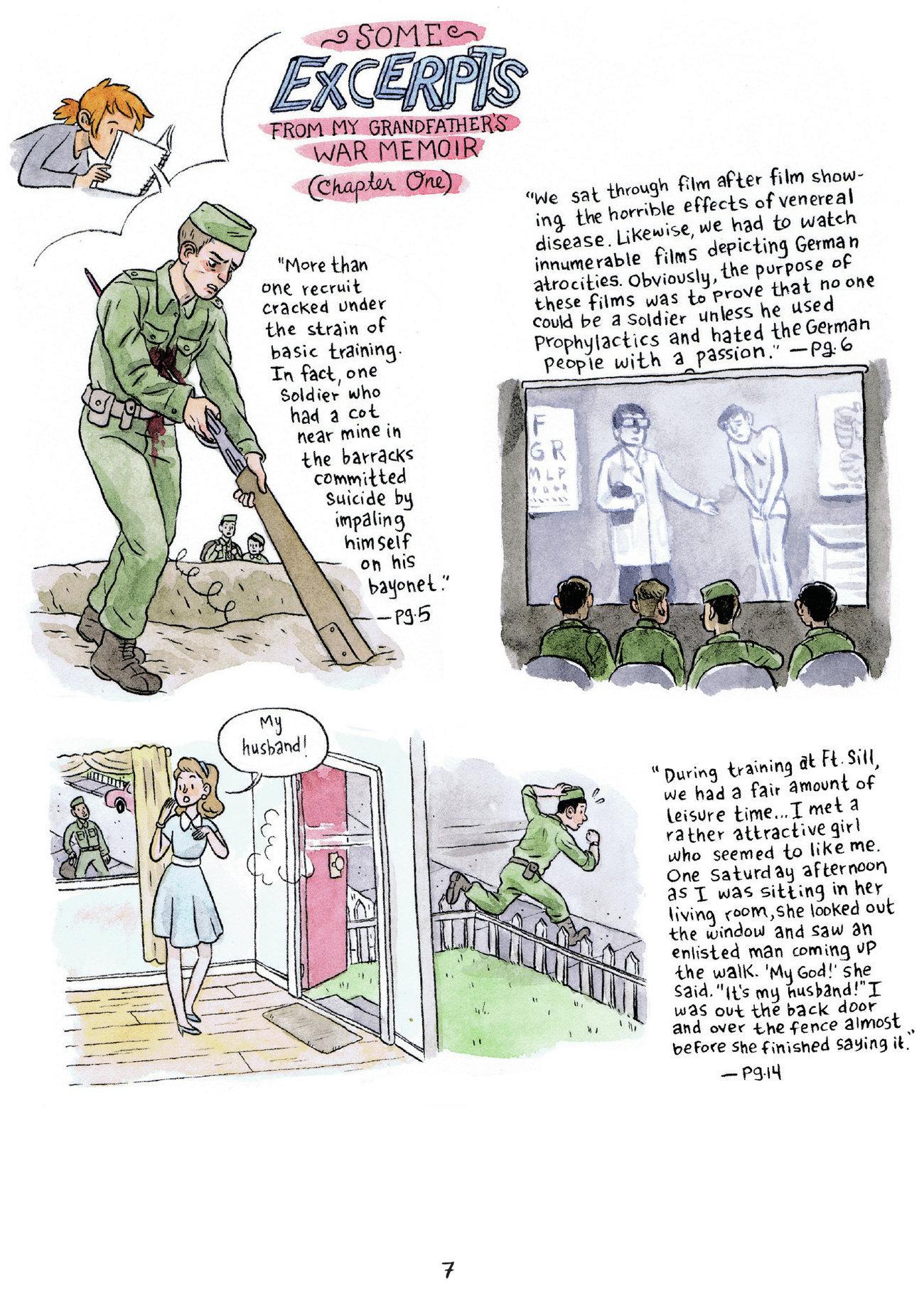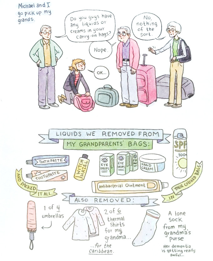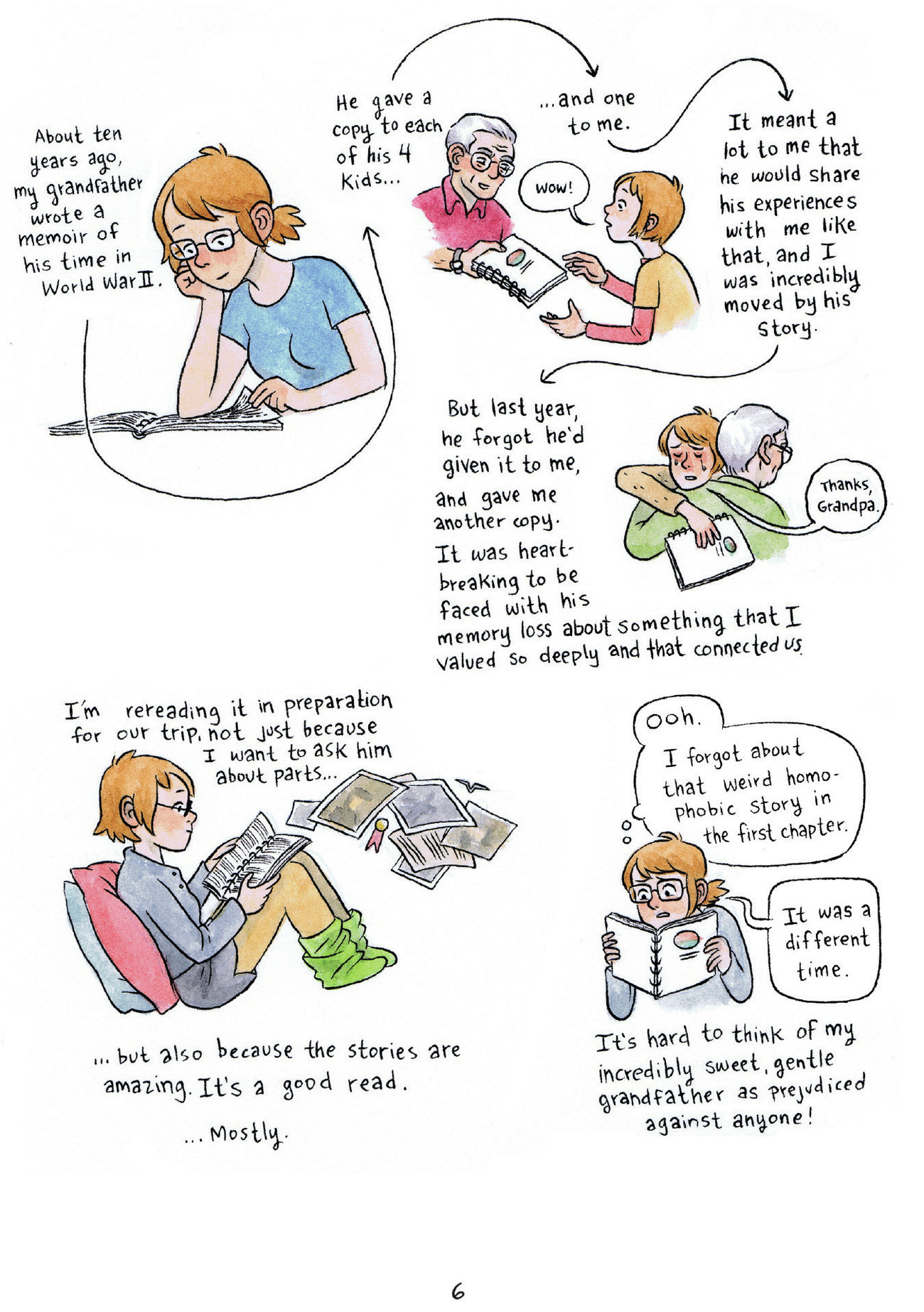 Amidst all this new scenery as she cares for them, she takes the opportunity to reflect on her relationship with her own parents, what her father’s relationship with his parents must have been like (the grands in this book), and her own mortality. Sandwiched in between all of that, she ends every chapter (which each cover a day in the trip) with an illustrated excerpt of her grandfather’s WWII memoir. The contrast between the stories he tells of his time in the Air Force as a young man really put into new perspective his current day life.