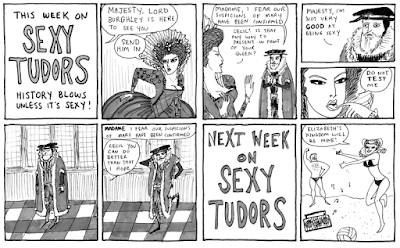 Divorced (Catherine of Aragon), Beheaded (Anne Boleyn) , Died (from complications of childbirth, Jane Seymour), Divorced (Marriage annulled, actually, but that doesn’t make it as catchy, Anne of Cleves), Beheaded (Catherine Howard), Survived (Katherine Parr). Six women, one hugely powerful, and as he aged, increasingly erratic and unpredictable ruler, whose chief obsession during his reign was to beget sons. Despite my Masters degree in History, where I spent part of a year studying the various Tudors, especially Elizabeth, I do love me some Sexy Tudors. Sadly, they never got round to showing Mary or Elizabeth’s reigns, but I’m confident that Kate Beaton has captured what it would have looked like: