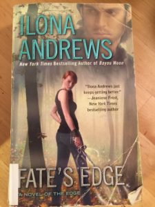 Fate’s Edge is the third book of The Edge series by Ilona Andrews. Kaldar Mar, cousin to Cerise from the previous book, is recruited by Lady Virai to retrieve a magical artifact stolen impossibly stolen from a literal Fort Knox type pyramid. If not retrieved, The Hand (bad guys) would have a devastating tool to wreak havoc in the Weird, Broken and Edge. Kaldar is a con man who loves a dangerous and challenging mission. That is his power – if you bet him to do something, it gives him the slightest magical luck to succeed. These days he’s working for The Mirror to get revenge on Spider, the big bad from the last book who got so many of Kaldar’s family killed, including his favorite Aunt Murid.