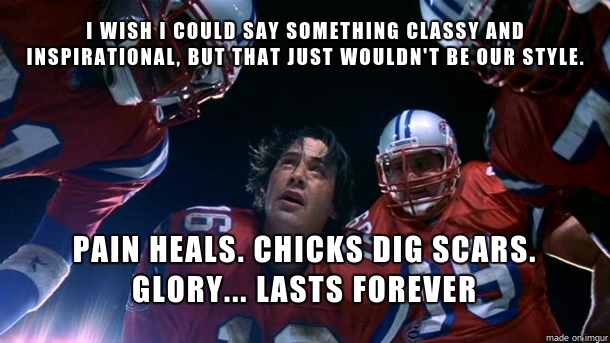 Warning: I am aware of football; I understand the general gist of what all is supposed to happen, but I am not a fan nor do I really agree with the purported logic behind the game. Katie hails from one of those states where it’s like a religion, so she might have to clarify some NFLisms or just flat out tell me to STFU. I mean, I didn’t understand 99.9% of the football meme jokes I found (AT ALL) so don’t expect a whole lot from me on that front.