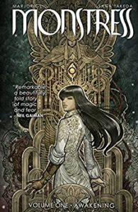 I think a few Cannonballers reviewed the Monstress series last year, and when I saw volume one at the local comic book store, the art was so beautiful I decided to make the purchase. The art is truly stunning, a combination of anime and Art Deco (the blurb on the back says Art Deco, but I think it looks a bit Nouveau; maybe elements of both). The story itself is complicated and involves a variety of races of creatures that have a complex history together. At the center of the story is a teenaged female named Maika Halfwolf, who is an “arcanic,” i.e., the halfbreed offspring of humans and ancients. The world these races inhabit is in flux due to wars and genocide directed against arcanics. Maika is on the run; she is on a quest of some sort but is also the object of others’ sinister interests.