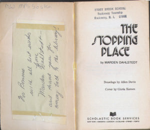 How many books have you hung on to since childhood? As the daughter of a librarian, my answer is, “not many.” I did hang on to my Scholastic Book Club copy of Marden Dahlstedt’s The Stopping Place, from fifth grade though. I recently came across my slim paperback story of a girl from Brooklyn forced to move to New Jersey’s Pine Barrens when her hippie family relocates. (The horror!)