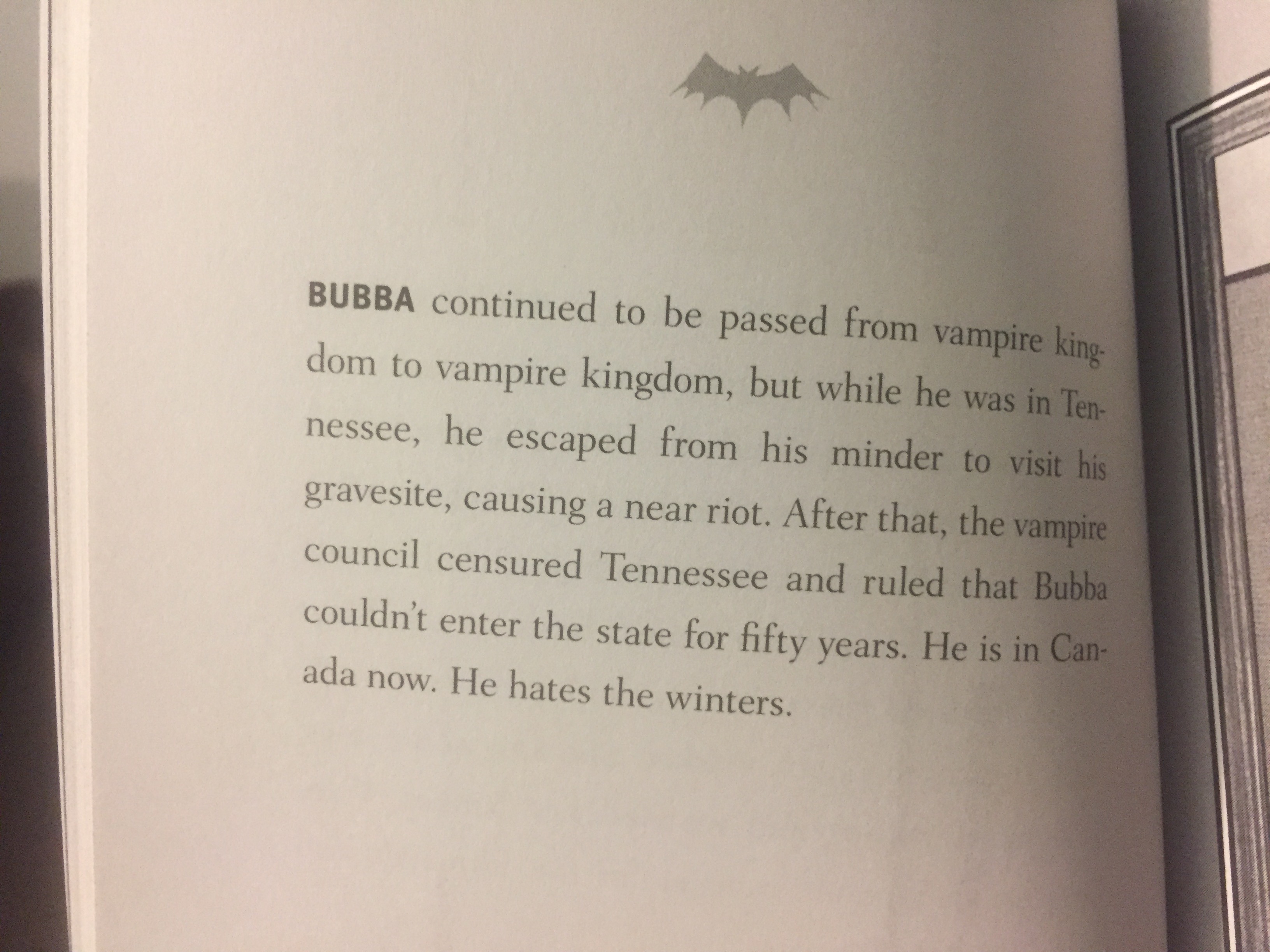 You’ll notice that this is actually a review of two books. Harris, bless her, couldn’t fit all the characters in her 13 book series into the end, and because fans are rabid things, she wrote a compendium which lists off many of the characters in alphabetical order and gives you their epilogue style update. When I found out about it I also requested it from the library because maybe my favorite character in the entire series, the only one I truly wish well (besides Sam), is the vampire Bubba. You know, Elvis. He did not make it into the last book so I checked out the other one just to get this half page of closure: