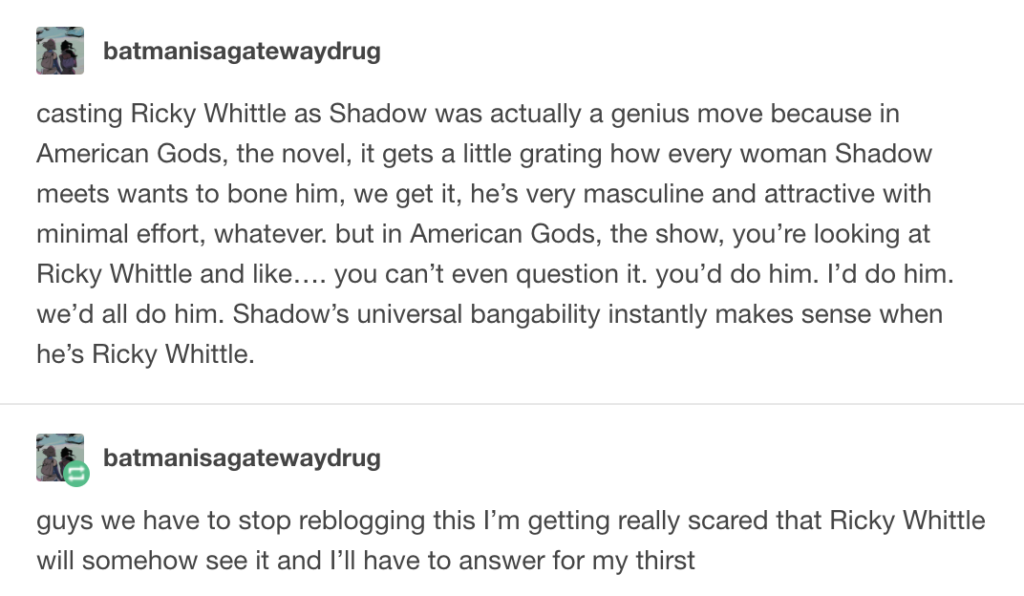 American Gods is the story of a man who goes by Shadow Moon, as he is sucked into working for a man called Mr. Wednesday, who is… well, a God. But an old one who along with many of the other “old Gods” in America are having a difficult time in the present day (some of their iterations in other parts of the world, however, are doing just fine), as less and less people remember and praise them, thus resulting in a loss of power. “New Gods”, however, are starting to crop up, in the form of things that modern-day people spend so much time and energy on: technology, media, etc etc. And so, what does this call for? A war between the old Gods and the new, of course!
