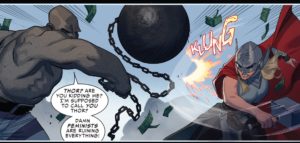 I haven’t come across Roxxon Corporation as a direct antagonist much in the Marvel Comic Universe, so I’m not sure if Thor and Roxxon have a special relationship, or if this is something new for a new, Midgard-born Thor. The Frost Giants are attacking an undersea Roxxon facility, joined by Malekith the Accursed, King of the Dark Elves.