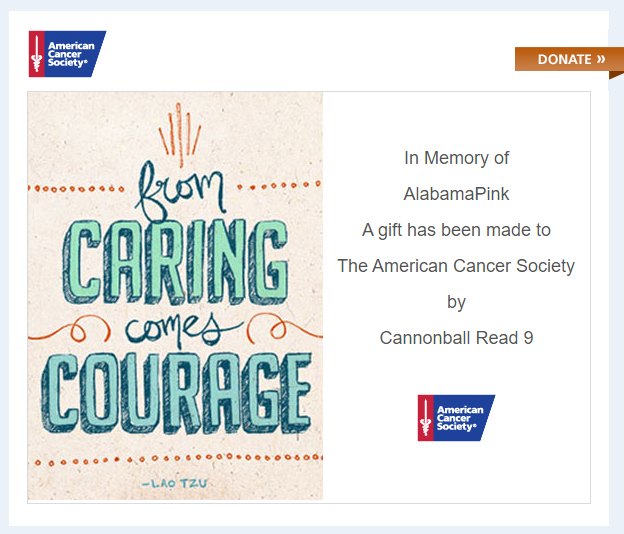I’m happy to announce our second CBR9 donation to The American Cancer Society for Cannonball Read 9, in the amount of $150! That brings our total for the year so far to $300.
