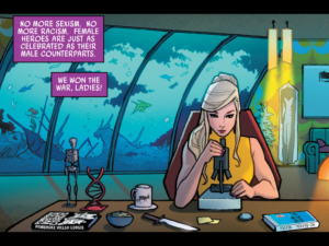 She does have a feminist agenda and isn’t afraid to point out the inequalities faced by women in the superhero business, and the general unfairness that as a society we have a hard time talking about tampons*.