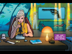 The art in Mockingbird is clean and clever. Sometimes it’s tightly focused, and other times it’s almost like a Richard Scarry book. Can you find Hulk sitting on the toilet? The details are rich.