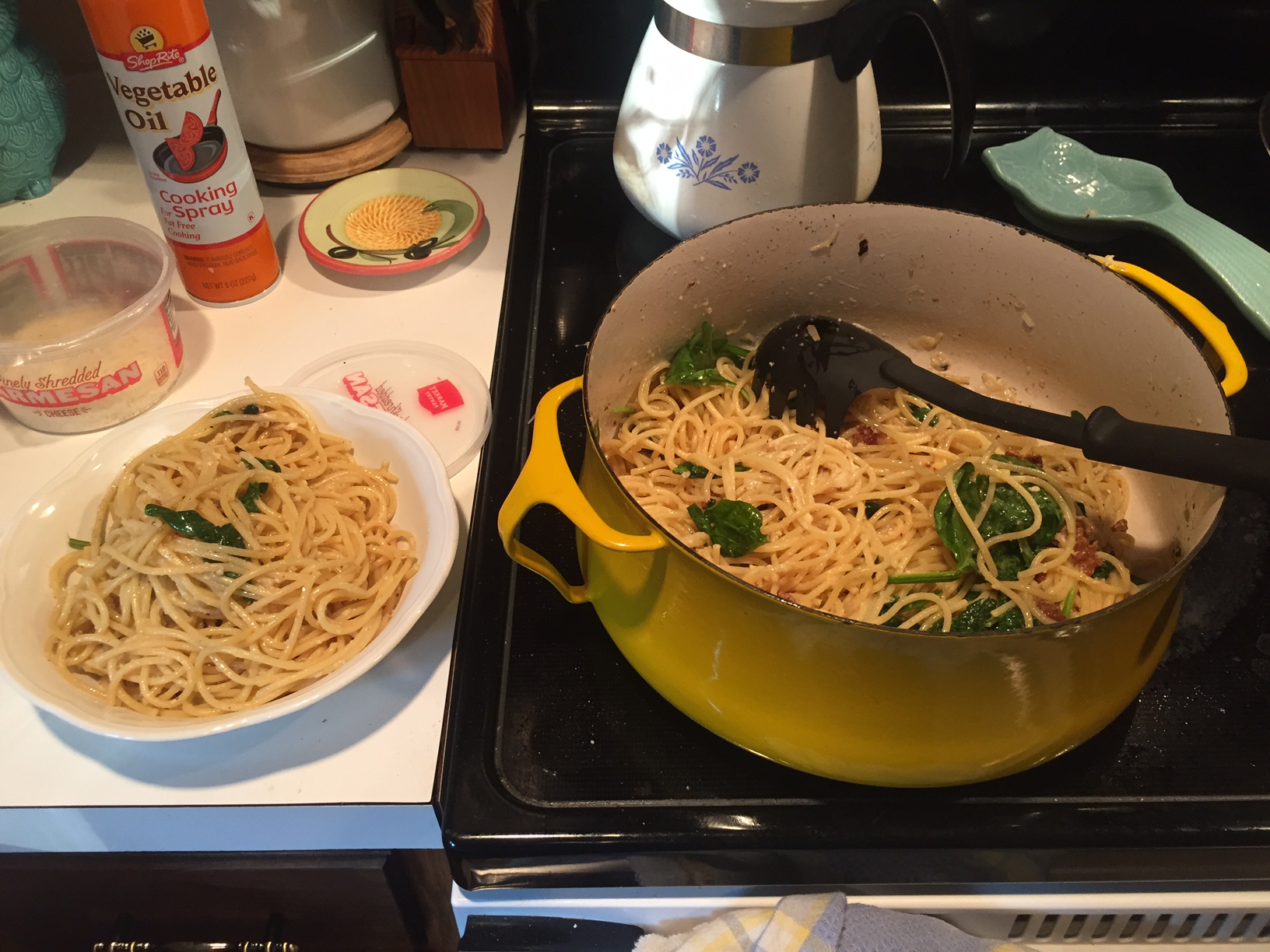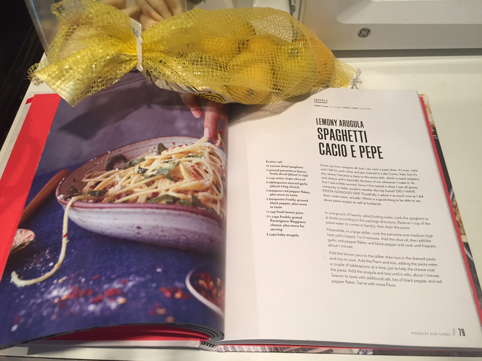 I had this book out from the library as long as they would let me (and honestly a few extra days) and wanted to wait to review it until I had actually managed to cook something from it. My first go was Lemony Arugula Spaghetti Cacio e Pepe. I was severely limited by my grocery options and my time, as well as my energy, and this dish was delicious. So much so in fact that I am seriously considering just buying the book for myself because there were far too many recipes to photocopy – I might as well get the bound version.