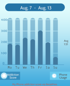 PS. I downloaded the Break Free app on my phone to evaluate just how much I use my phone. Because I did so just after reading the book, the numbers are artificially depressed. (And I was beginning to be walloped by the flu on that Sunday.)