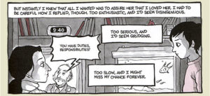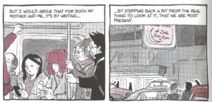 A question Bechdel and her mother seem to struggle with a lot, as Bechdel reveals intimate personal issues about her family in her books, is whether art is better when it is generalized, apart from the self, or if it is truer when it is up close and personal. The mother thinks Bechdel’s art is far too intimate and personal, whereas Alison believes that is the only way art can be. I can’t help but think it is fitting that the mother is an actress, taking generalized words upon her to act a part whereas Bechdel is a writer who is much closer to the production of the story.