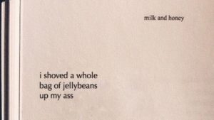 Milk and Honey is not a collection of poetry. There is no poetry inside. There are stilted, maimed sentences and simple clean drawings, but not an inch of poetry. Sure there is trauma and heartbreak and hope and love, but an openness about trauma is not poetry.