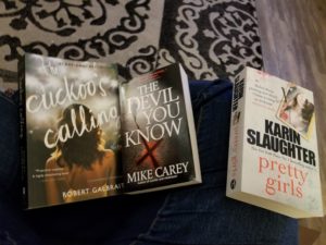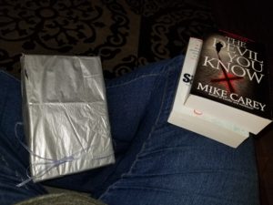 So this is my first book exchange. The lovely Teresa Electro got me in the exchange. She sent me a box with three wrapped (!) books inside, plus a bookmark. She even sent a handwritten card! She either read through my Goodreads “to read” pile, or looked through my CBR reviews, because she sent me books I ABSOLUTELY want to read. I’m so excited about reading these books! I was so excited when I opened the box that I started taking pictures of the books on my lap (my sister thought I was insane):