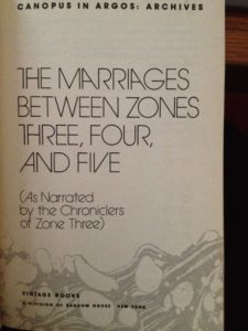 This book is far from the first or last of its kind. This is a on-the-ground version of events from the previous book. Not so much as a retelling of the same story, because in fact it’s a very different story altogether, but a retelling of a perspective. Gone is the colonial voice of George Sherban (Johor) and his ilk, and instead we get the collective story-tellers of Zone Three, a put-upon area of Canopus on Earth (Shikasta) as their culture is threatened by the violent political outreaches of Zone Five, whose warlike nature looms over the marriage between its leader Ben Ata, and our Zone Three protagonist Al Ith. The resulting novel is sort of the opposite of a comedy of manners, because this novel, like a lot of Doris Lessing is relatively humorless, but does involve the kind of marriage and blending of cultures that biological impulses of love, sex, and marriage allow for.