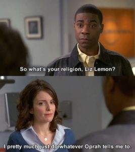 I continued my re-visiting of celebrity memoirs in audio-book form by listening to Tina Fey’s Bossypants and it was a delight. Tina Fey is one of my favorite humans and 30 Rock is one of my favorite TV shows. As I write this my husband and I are watching the series finale following what was most likely our 15th or 16th re-watch.* We probably couldn’t go a whole day without dropping at least one 30 Rock line.** I seriously considered having this whole review just being 30 Rock gifs but I suppose I should write at least a few lines.
