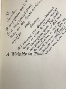 “It was a dark and stormy night.” The opening of this book imprinted itself on my ten-year-old brain in ways I didn’t fully realize until I returned to it over four decades later. I first read A Wrinkle in Time in 1975 when my grandmother, a children’s librarian, gave me a copy for my birthday. It wasn’t just any copy; it was a signed copy that my grandmother had purchased in 1963 when she attended the Newberry-Caldecott award dinner in Chicago—almost two years before my parents would meet in a crowded bar in Grinnell, Iowa. On faith that she would one day have a granddaughter or two that were readers, she purchased A Wrinkle in Time along with a copy of The Snowy Day by Ezra Jack Keats, which was one of my first picture books.
