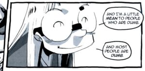 Artistically it’s an interesting style, an almost naive black & white approach for the most part with vivid detail particularly around the fantasy elements. There’s also a very interesting choice of scribbled out words in dialogue for the parts that Barbara doesn’t want to hear, because then it makes it real.