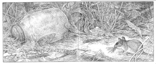 The majority of the book covers Whitefoot’s journey on the log. It’s a very simple story, but one packed with charm and meaning. I admire Berry’s ability to bring us into the mouse’s world by describing how she sees it: “To imagine the life and adventures of Whitefoot, you must compress your mind to her size. Think of going about with your eyes only an inch or two from the ground, among grass stems thicker than your thumb, weed stems thicker than your wrist, maple and oak leaves that you can slip under and hide, trees that touch the sky.” So skillfully does he bring us physically down to mouse level, that we can see the world the way she sees it. When the rains come, we’re unsettled because we can imagine now what that rain must be like for something that is only a couple of inches tall.