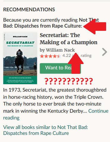 A fun postscript. This is what Goodreads thought it would be a good idea to recommend to me because I read this book: