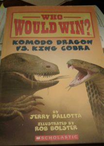 My special needs cousin loved the Who Would Win series. It was a tough read at the time, but it got a struggling student/child/reader to want books. (I gladly gave him what books he did not have for a Christmas gift, because, YAY! Books!) I picked up Komodo Dragon vs. King Cobra and wondered what took me so long to find them? (But I think the author picked the wrong winner!)