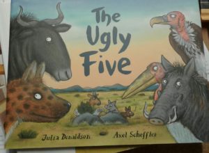 The Ugly Five is a FIVE rating all around. I had known about the group of animals called The Ugly Five but had forgotten about them until reading Julia Donaldson’s book. At the end, she gives more information on the different animals as well as the others in the “Five Series” of animals: The Big 5, The Little Five, The Ugly 5, The Shy 5 and The Impossible 5.