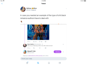 In a lot of ways, this book was a love letter to female friendships and to Romancelandia. If you want to see that women supporting women in romance land in action, go look for #MindYourBusinessElena. Open white supremacist Elena Haskins freaked out over the cover because a white man is with a black woman.