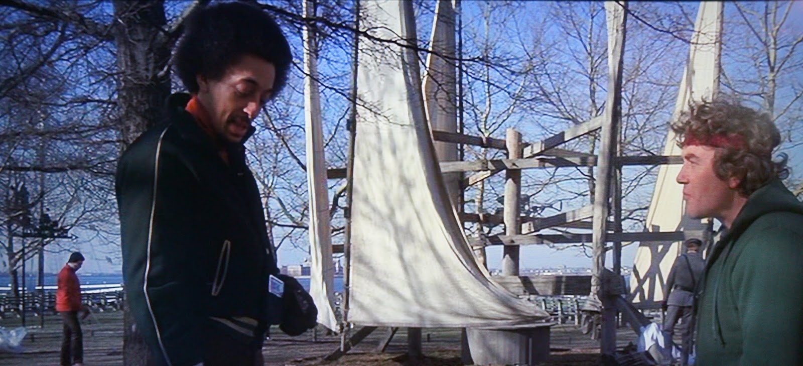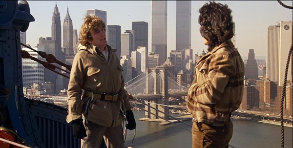 Finney gets up in the world to talk to Edward James Olmos, with the WTC (sniff) in the background |