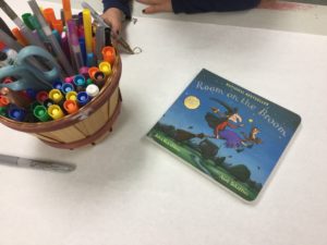 Kids like repetition, so I have read Room on the Broom several times. One of the reasons I like it is because it shows several anxious situations made better through community, sharing, and cooperation. The Witch and her cat are riding their broom and along the way she loses her hat, her bow, and her wand. A dog, a bird, and a frog help her find her things and ask for a ride on the broom. When the Broom breaks, she encounters a dragon who is going to eat her with fries until it is scared away by a strange creature with 4 heads, eight eyes and strange voices. The witch conjures up a new broom that has seats for them all and off they fly.