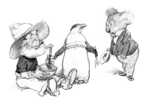 What Bill and Sam, the “professional puddin’ owners”, constantly have to worry about though are the “professional puddin’-thieves”; a possum and a wombat who are also hustling for a good feed. Whenever they all cross paths, Bill and Sam feel obliged to fight them. Bill and Sam might have slightly guilty consciences here that makes them defensive; they didn’t come by Albert 100% honestly themselves, although they could plead extenuating circumstances.