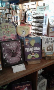 Does Frankenstein Get Hungry? That is the question on the mind of a little sleepless girl. Well, one of many questions anyway. These questions make the “ghoulish seem foolish” and as she asks them, she is able to overcome her fears of the “things in the dark.” Monsters are no match for the imagination of this heroine! Of course, the adult will realize what is going on, especially on the last page as certain things come to light.