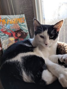 Earlier this year I accidentally read the fourth Ms. Marvel graphic novel before the third, Ms.Marvel: Crushed. Instead of immediately going back and reading number three I went on to read other things. When I was ready to pick it up, I couldn’t find it, the house seemed to have eaten it. About two weeks ago it resurfaced and I decided to save it to complete my cannonball. Sosuke is not as thrilled as I am, since his nap was disturbed to take this photo.