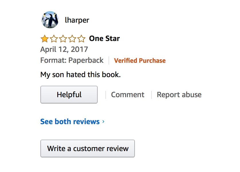 So she’s not the type of woman who would, say, leave a lame-ass review on Amazon of a novel she’s never read because her stupid kid didn’t like it: