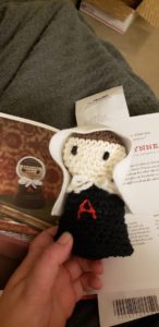 I still have a couple of issues with the book though. For example, instead of a page with a depiction of each crochet stitch (something most crochet books have) the book directed you to a website and advised you to be familiar with crochet. The website was helpful, but I didn’t really appreciate having the book out, the project in my hands and then discover that I needed to access a website in order to figure out how I was supposed to decrease the stitch. This doesn’t make the book a bad book, but it does make it one that isn’t for beginning hookers. I also need to give a shout out to the ladies in the Pajiba Yarn Wall Facebook Group, who helped me with the eyes. I didn’t want to get the plastic eyes recommended in the book (and I don’t do hot glue guns, at all), and those ladies gave me some options, including a knot that that I ended up using and I wish had been an option in the book. Finally, and here’s where I get pedantic, the line is “On a field, sable, the letter A, gules”; meaning a red letter A on a black background. The directions wanted you to do Hester’s dress in brown. And while that’s valid, as the ‘field’ could be a patch instead of the whole dress, for a small doll you’re not going to do a patch like that. So I rebelled and did Hester’s dress in black. You guys, I love her. I love her so much. Overall, the instructions were easy to follow, and I’m excited to try my hand at a few more literary figures (and adapt a few patterns to make other dolls).
