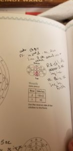 esired. The first problem I have, and this is a me problem, is that the patterns are diagrams and not written out in the manner that I am used to. Fortunately there is a section that tells you what each symbol on the diagrams represents and so I was able to figure it out. Ok, I just wrote out the pattern using the diagram as a guide. I’m not super happy with some of them, I had trouble with the ears and nose especially.